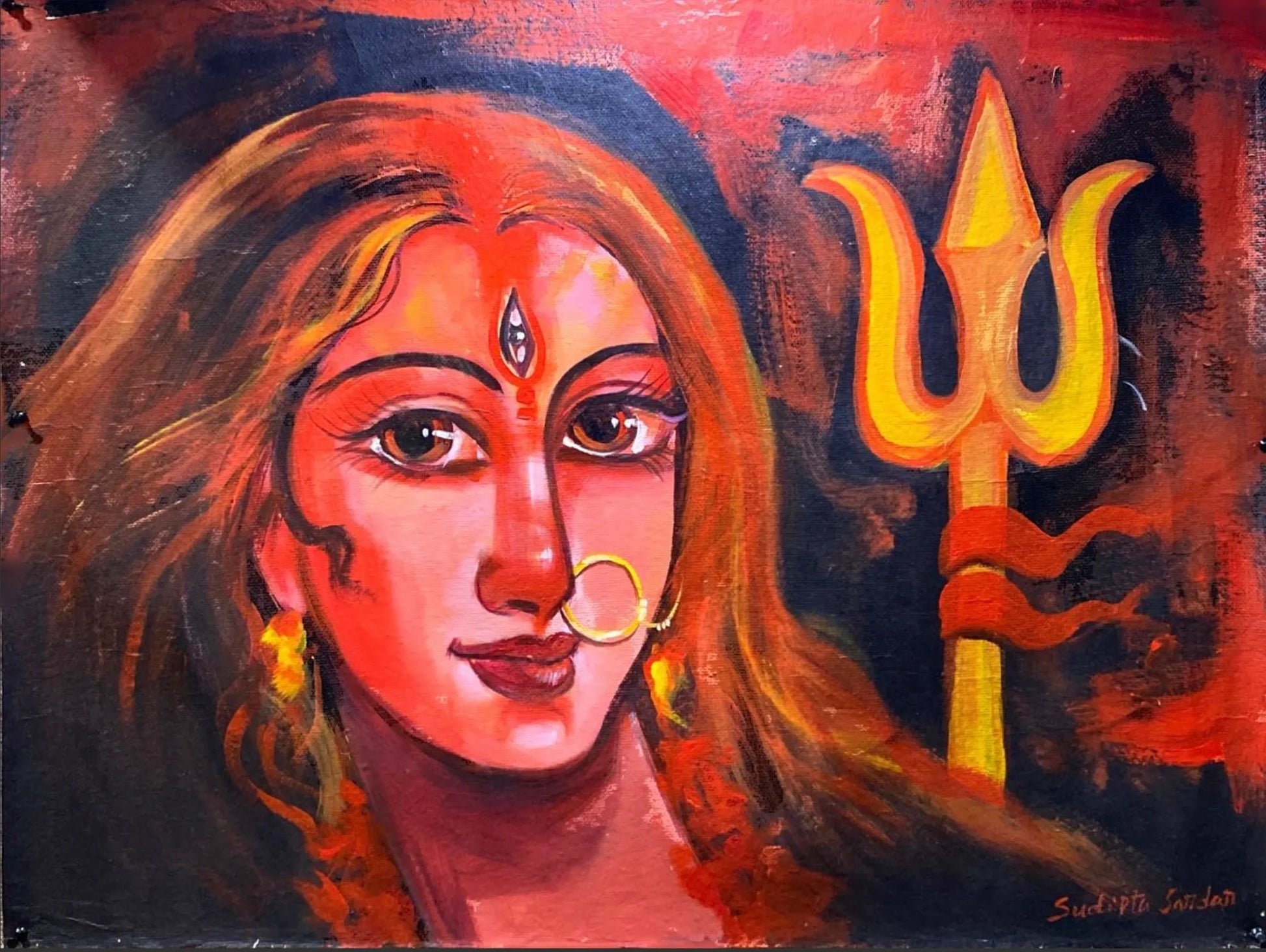 The red and yellow depicts purity and peace. The three spikes of the Trishul represent the three gunas(elements of matter) Sattva, Rajas, and Tamas