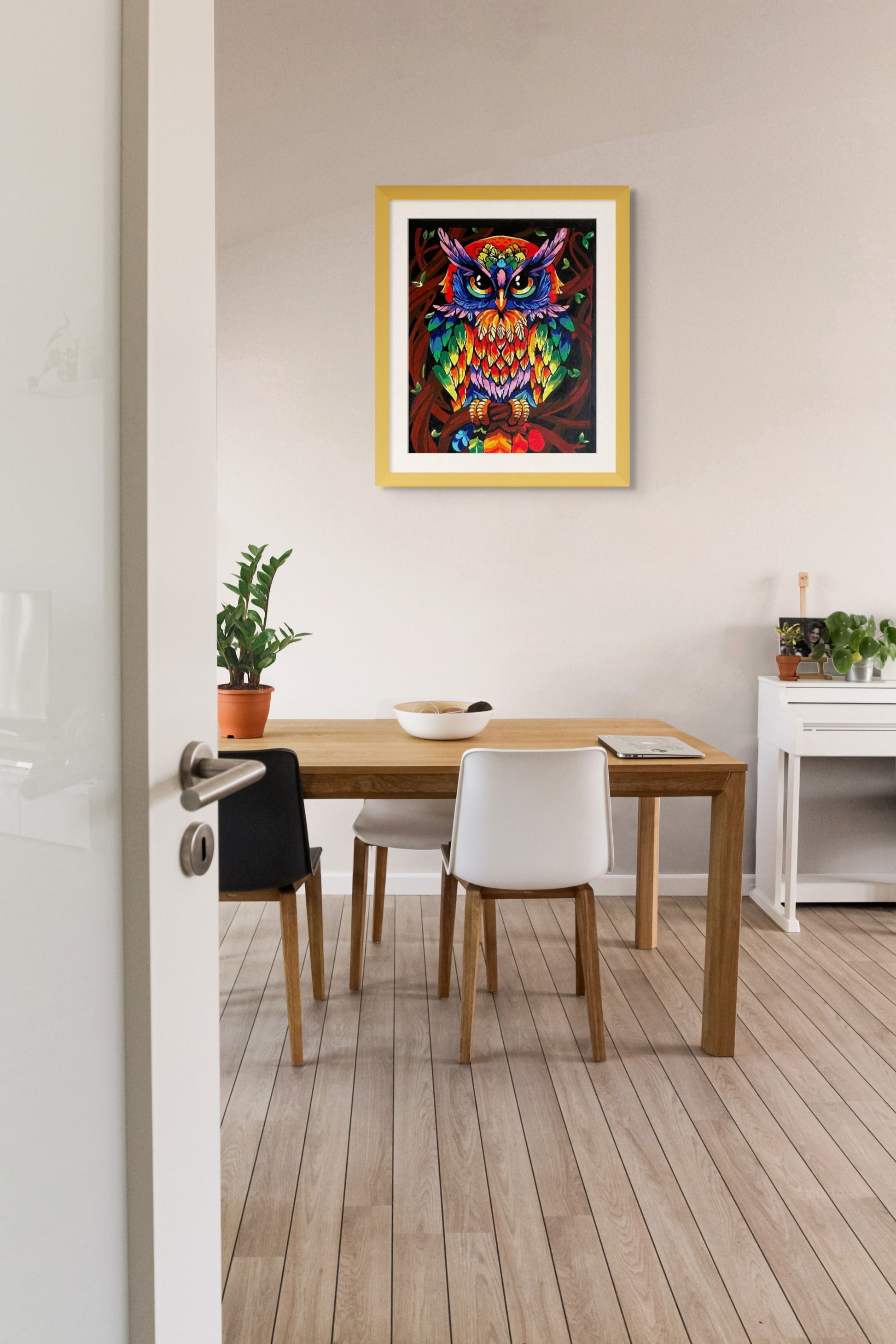 This dynamic acrylic painting showcases a colorful and intricately detailed owl, symbolizing wisdom, mystery, and intuition.
